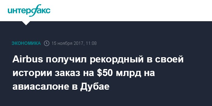 Airbus получил рекордный в своей истории заказ на $50 млрд на авиасалоне в Дубае