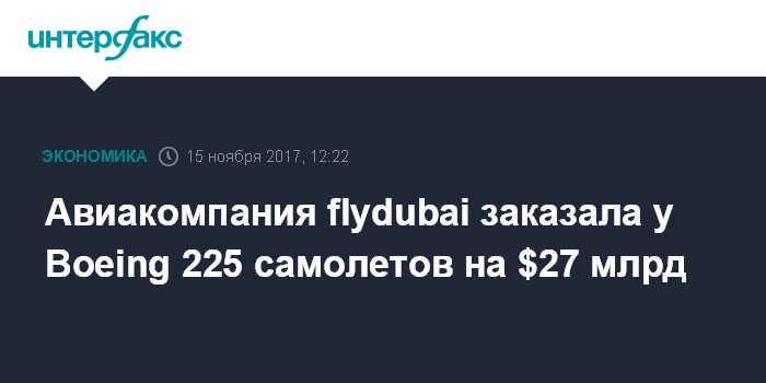 Москва. 15 ноября. INTERFAX.RU - Бюджетный авиаперевозчик flydubai, являющийся частью холдинга Emirates Group (ОАЭ), заключил соглашение о приобретении 225 самолетов Boeing общей каталожной стоимостью $27 млрд в ходе авиасалона в Дубае.