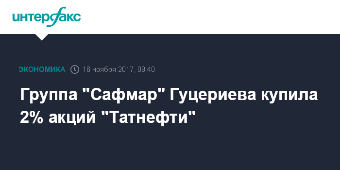 Москва. 16 ноября. INTERFAX.RU - Промышленно-финансовая группа "Сафмар" Михаила Гуцериева купила примерно 2% акций "Татнефти", сообщил "Интерфаксу" источник, близкий к группе.
