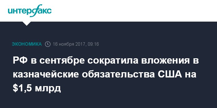 Москва. 16 ноября. INTERFAX.RU - Россия в сентябре 2017 года сократила вложения в казначейские обязательства США (US Treasuries), свидетельствуют результаты исследования американского Минфина.