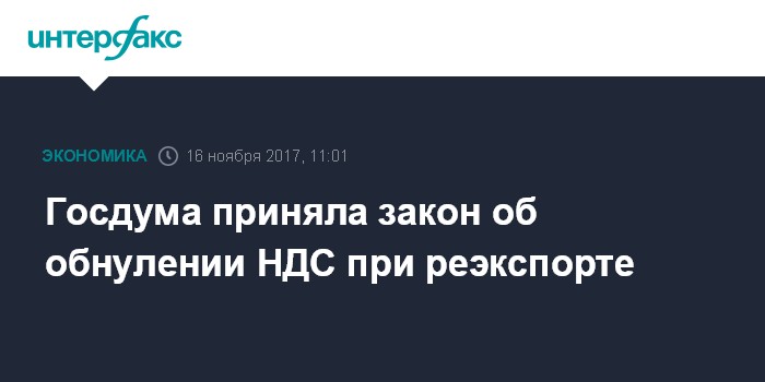 Москва. 16 ноября. INTERFAX.RU - Госдума на заседании в четверг приняла в окончательном, третьем, чтении поправки в Налоговый кодекс (НК) РФ, предусматривающие обнуление НДС при реэкспорте товаров, а также распространение нулевой ставки не только на реэкспортируемые товары, но и на услуги по их перевозке и транспортировке.