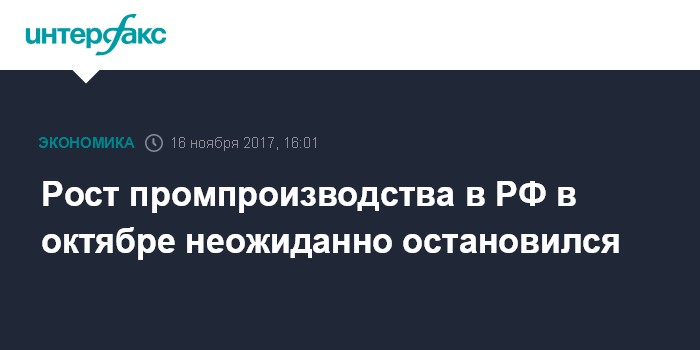 Москва. 16 ноября. INTERFAX.RU - Промышленное производство в России в октябре 2017 года продемонстрировало нулевой прирост по сравнению с октябрем 2016 года, сообщил в четверг Росстат. Показатель оказался значительно ниже ожиданий экономистов - консенсус-прогноз, подготовленный "Интерфаксом", предполагал увеличение промпроизводства на 1,0%.