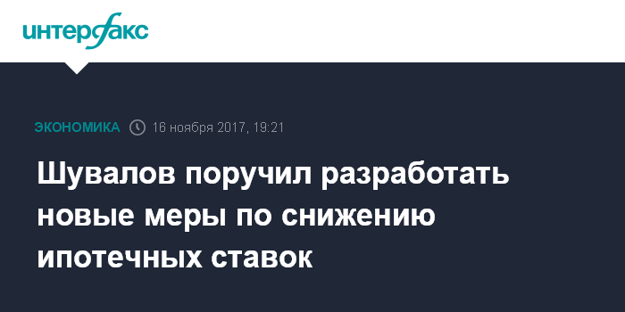 Москва. 16 ноября. INTERFAX.RU - Первый вице-премьер РФ Игорь Шувалов 7 ноября поручил Минстрою, Минфину и Минэкономразвития совместно с Агентством ипотечного жилищного кредитования (АИЖК) обеспечить выполнение указания президента РФ Владимира Путина о разработке мер по снижению ипотечных ставок, сообщил "Интерфаксу" источник в финансово-экономическом блоке правительства.
