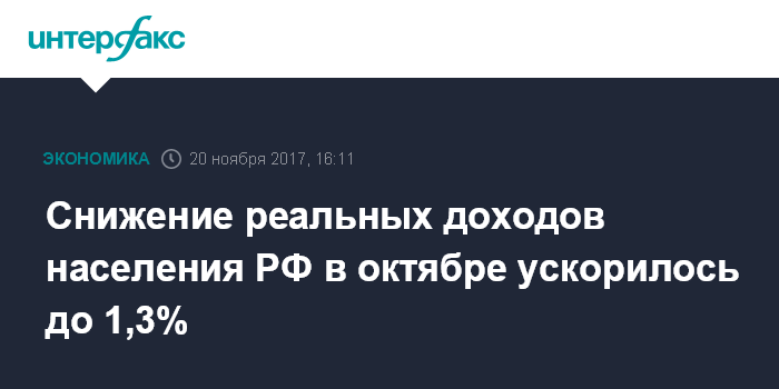 Москва. 20 ноября. INTERFAX.RU - Реальные располагаемые денежные доходы населения РФ в октябре 2017 года снизились на 1,3% по сравнению с аналогичным месяцем 2016 года, сообщила в понедельник Федеральная служба государственной статистики (Росстат). В сентябре и августе снижение реальных доходов равнялось 0,3% в годовом выражении.