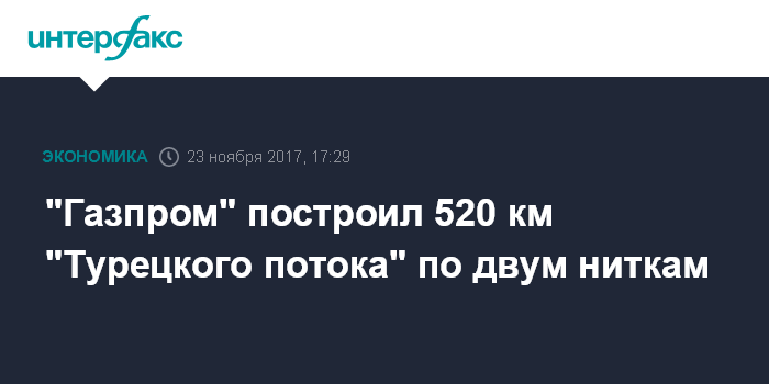 Москва. 23 ноября. INTERFAX.RU - "Газпром" с 7 мая уложил суммарно по двум ниткам газопровода "Турецкий поток" более 520 км магистрали.