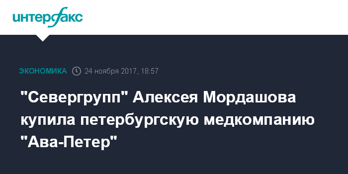 Москва. 24 ноября. INTERFAX.RU - Группа компаний "Севергрупп", деятельность которой связана с осуществлением долгосрочных инвестиций в интересах Алексея Мордашова, приобретает ООО "Ава-Петер" (владеет частными клиниками "Ава-Петер" и "Скандинавия"), говорится в сообщении группы.
