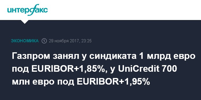 Газпром занял у синдиката 1 млрд евро под EURIBOR+1,85%, у UniCredit 700 млн евро под EURIBOR+1,95%