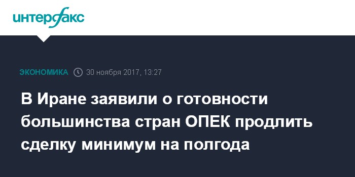 Москва. 30 ноября. INTERFAX.RU - Большинство стран ОПЕК выступают за продление соглашения об ограничении добычи нефти минимум на шесть месяцев, максимум - на девять месяцев, заявил министр нефти Ирана Бижан Намдар Зангане.