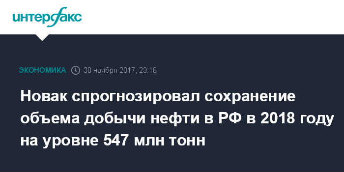 Москва. 30 ноября. INTERFAX.RU - Объем добычи нефти в России в 2018 году сохранится на уровне 547 млн тонн, сообщил журналистам глава Минэнерго Александр Новак.