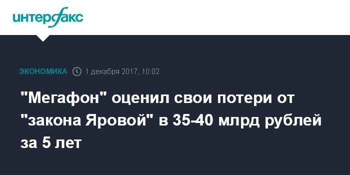 Москва. 1 декабря. INTERFAX.RU - "Мегафон" оценивает свои затраты на реализацию так называемого "закона Яровой" в 35-40 млрд рублей суммарно в течение пяти лет.
