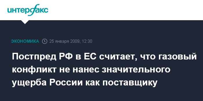Москва/Брюссель. 25 января. INTERFAX.RU - Постоянный представитель России при ЕС Владимир Чижов считает, что конфликт, связанный с транзитом российского газа в Европу, не нанес значительного ущерба России как поставщику.