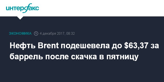 Нефть Brent подешевела до $63,37 за баррель после скачка в пятницу