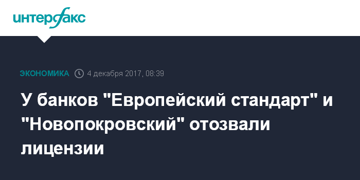 Москва. 4 декабря. INTERFAX.RU - Банк России отозвал лицензии на осуществление банковских операций у московского банка "Европейский стандарт" ("Евростандарт") и краснодарского банка "Новопокровский", говорится в сообщении ЦБ.