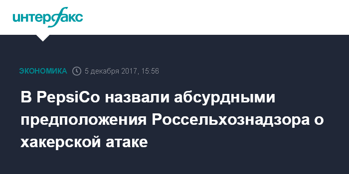 Москва. 5 декабря. INTERFAX.RU - Компания PepsiCo считает абсурдными предположения Россельхознадзора о хакерской атаке. "PepsiCo категорически отвергает абсурдные предположения Россельхознадзора как не имеющие под собой никаких оснований", - говорится в сообщении компании со ссылкой на вице-президента по корпоративным отношениям PepsiCo Восточная Европа Сергея Глушкова.