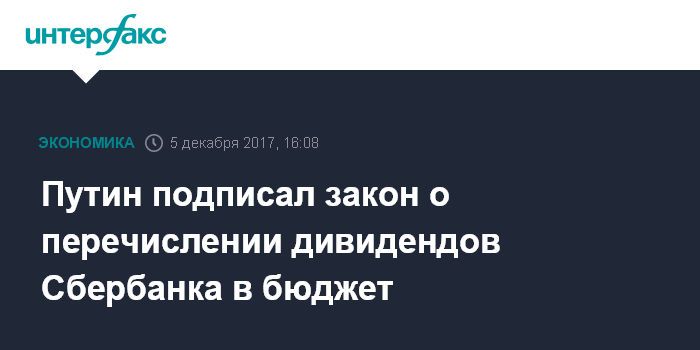 Москва. 5 декабря. INTERFAX.RU - Президент РФ Владимир Путин подписал закон, позволяющий Сбербанку в 2018 году перечислить часть дивидендов напрямую в бюджет и затем провести взаимозачет этой суммы при перечислении в бюджет прибыли ЦБ РФ в 2019 году.