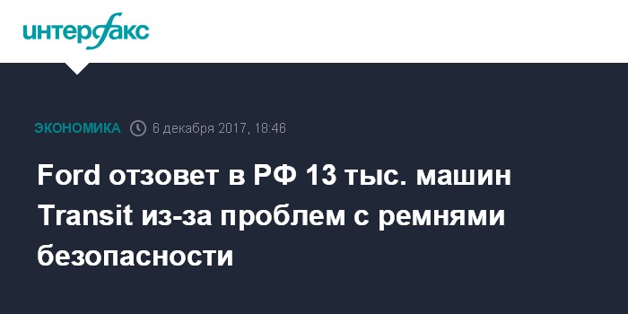 Москва. 6 декабря. INTERFAX.RU - Американский автопроизводитель Ford отзывает в России более 13 тысяч автомобилей Transit из-за проблем с ремнями безопасности.
