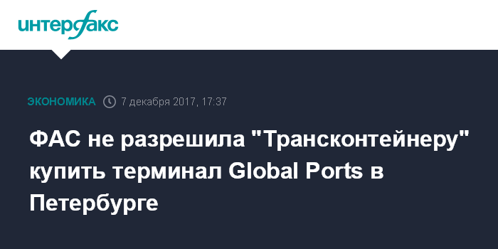 Москва. 7 декабря. INTERFAX.RU - Федеральная антимонопольная служба отклонила ходатайство "Трансконтейнера" о покупке 100% акций в ЗАО "Логистика Терминал" (ЛТ, входит в группу Global Ports), сообщило ведомство.