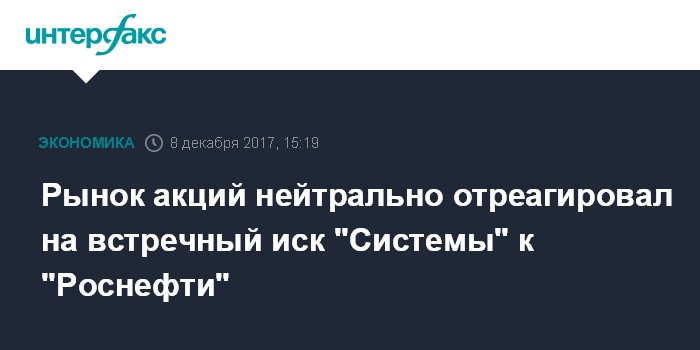 Москва. 8 декабря. INTERFAX.RU - Рынок акций в пятницу нейтрально отреагировал на встречный иск АФК "Система" к "Роснефти" и АНК "Башнефть" о возмещении ущерба в размере 330 млрд 448,8 млн рублей.