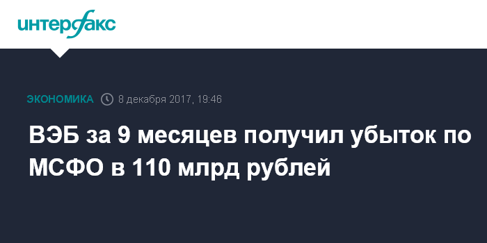 Чистый убыток за 9 месяцев достиг 110,4 млрд рублей против отрицательного финансового результат в 86,2 млрд рублей за тот же период прошлого года (тогда результаты банка улучшили госсубсидии на условиях, позволивших ВЭБу отразить доход в 134,9 млрд рублей).