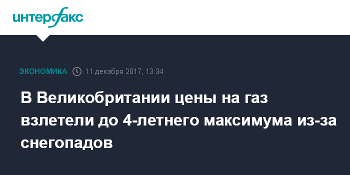 Москва. 11 декабря. INTERFAX.RU - Цены на газ на британском спотовом хабе National Balancing Point (NBP) в понедельник с открытием торгов взлетели к уровням 4-летнего максимума, после того как понизилась температура и большая часть королевства в выходные была покрыта снегом, сообщает агентство Bloomberg.