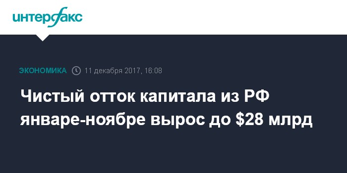 Москва. 11 декабря. INTERFAX.RU - Чистый отток капитала из РФ за 11 месяцев 2017 года вырос в 3,4 раза, до $28 млрд по сравнению с аналогичным периодом 2016 года, когда он составил $8,2 млрд, свидетельствуют материалы Банка России.