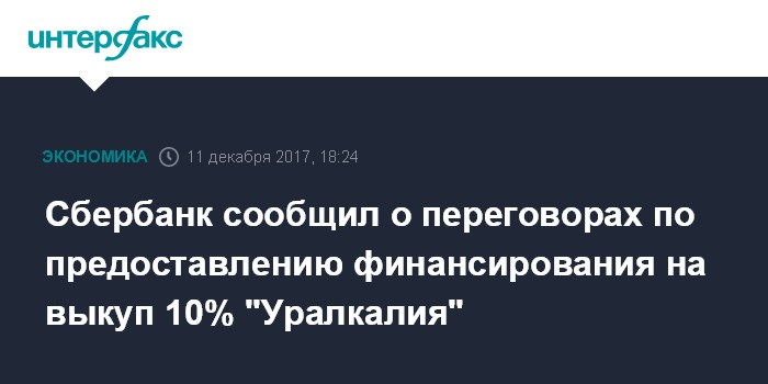 Москва. 11 декабря. INTERFAX.RU - Сбербанк России находится в переговорах по поводу предоставления финансирования для сделки по выкупу 10% акций "Уралкалия" "УралХимом", сообщил журналистам первый зампред правления Сбербанка Максим Полетаев.