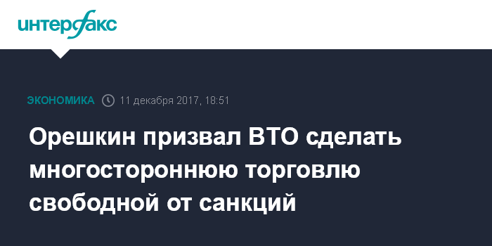 Москва. 11 декабря. INTERFAX.RU - Глава Минэкономразвития РФ Максим Орешкин назвал санкции одной из самых агрессивных форм протекционизма, призвав членов ВТО сделать многостороннюю торговлю свободной от этого явления.