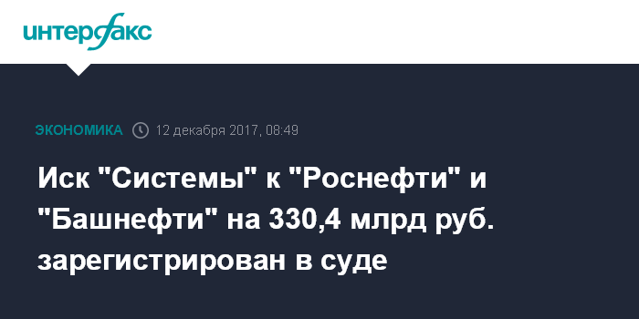 Москва. 12 декабря. INTERFAX.RU - Арбитражный суд Москвы зарегистрировал иск АФК "Система" к "Роснефти" и "Башнефти" о возмещении 330,4 млрд рублей, следует из базы данных суда. Иск пока не принят к производству.