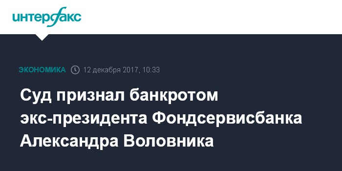 Москва. 12 декабря. INTERFAX.RU - Арбитражный суд Москвы в понедельник, 11 декабря, признал несостоятельным (банкротом) бывшего президента Фондсервисбанка Александра Воловника. Как сообщается на сайте суда, в отношении должника введена процедура реализации имущества.