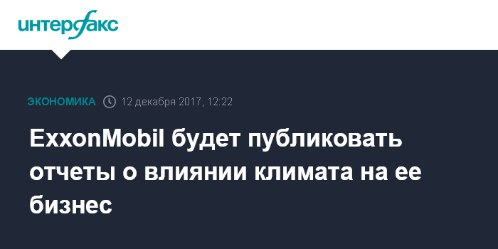 Москва. 12 декабря. INTERFAX.RU - Американская нефтегазовая ExxonMobil начнет публиковать отчеты о возможном влиянии климатической политики на ее бизнес в ответ на требования инвесторов улучшить систему раскрытия рисков, с которыми сталкивается компания.