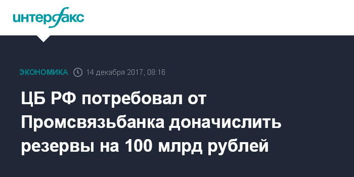 Москва. 14 декабря. INTERFAX.RU - ЦБ РФ на днях потребовал от Промсвязьбанка доначислить резервы на сумму более 100 млрд рублей, пишет газета "Ведомости" со ссылкой на свои источники.