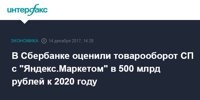 Москва. 14 декабря. INTERFAX.RU - Совместное предприятие "Яндекса" и Сбербанка на базе "Яндекс.Маркета" к 2020 году достигнет товарооборота (gross merchandise volume, GMV) в 500 млрд рублей. Такой прогноз озвучил первый зампредправления Сбербанка Лев Хасис на презентации стратегии.