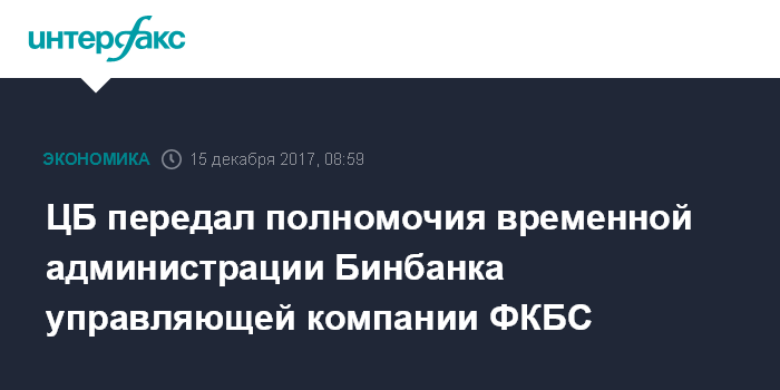 Москва. 15 декабря. INTERFAX.RU - ЦБ РФ передал полномочия временной администрации по управлению Бинбанком управляющей компании Фонда консолидации банковского сектора" (УК ФКБС), говорится в сообщении регулятора.