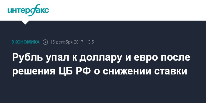 Москва. 15 декабря. INTERFAX.RU - Российский рубль упал к доллару и евро на Московской бирже днем, отыгрывая решение ЦБ РФ снизить ключевую ставку сразу на 50 базисных пунктов - до 7,75% годовых. Участники торгов ожидали более скромного снижения - на 25 базисных пунктов - до 8,00% годовых.