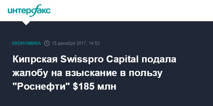 Москва. 15 декабря. INTERFAX.RU - Кипрская Swisspro Capital подала апелляционную жалобу на решение Арбитражного суда Москвы, который 24 октября решил взыскать с нее в пользу "Роснефти" $184,8 млн по контракту на поставку нефти, заключенному в марте 2014 года, следует из материалов суда. Денежные средства должны быть взысканы в рублях по курсу ЦБ РФ на дату выплаты долга.