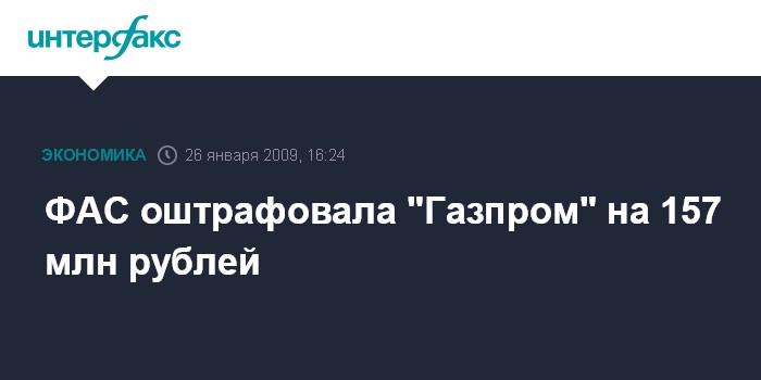 Москва. 26 января. INTERFAX.RU - Федеральная антимонопольная служба (ФАС) оштрафовала ОАО "Газпром" за нарушение антимонопольного законодательства на 157,716 млн рублей, говорится в сообщении ФАС.