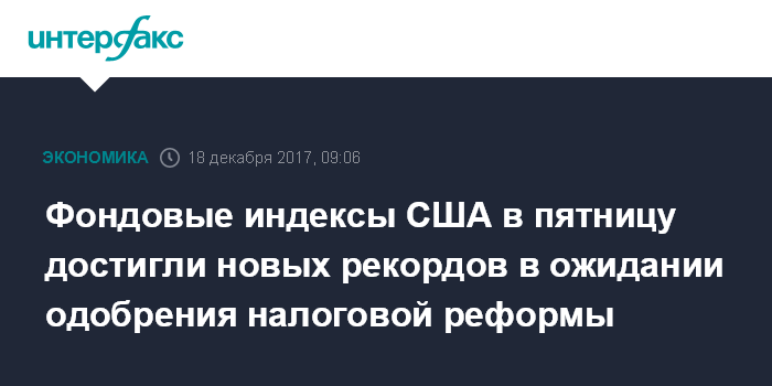 Москва. 18 декабря. INTERFAX.RU - Американские фондовые индексы выросли в пятницу до новых рекордов на возросшем оптимизме относительно скорого принятия законопроекта о налоговой реформе в США.