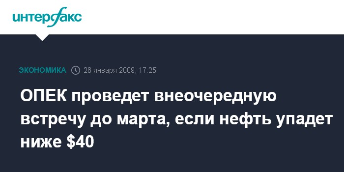 Москва. 26 января. INTERFAX.RU - Организация стран-экспортеров нефти (ОПЕК) может провести внеочередное заседание до официальной встречи 15 марта, если мировые цены на нефть упадут ниже $40 за баррель, сообщило агентство Bloomberg со ссылкой на министра нефти Анголы Ботелхо де Васконселоса.