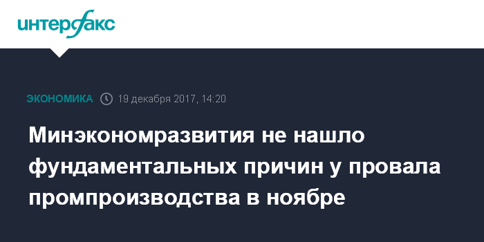 Москва. 19 декабря. INTERFAX.RU - Провальный результат, зафиксированный Росстатом в промпроизводстве в декабре - снижение на 3,6%, максимальное с 2009 года падение, объясняется набором временных факторов и не носит фундаментального характера, полагает Минэкономразвития.