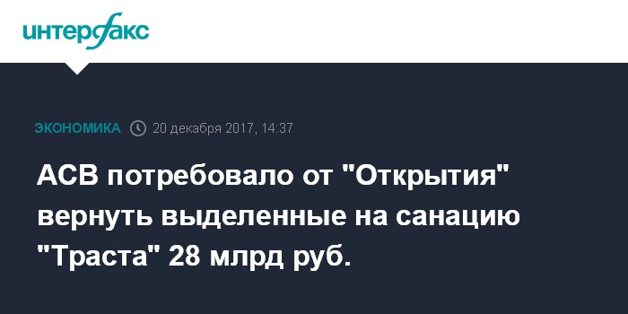 Москва. 20 декабря. INTERFAX.RU - Агентство по страхованию вкладов требует от "Открытие Холдинга" вернуть 28 млрд рублей, выделенных ему в рамках санации банка "Траст", говорится в заявлении холдинга.