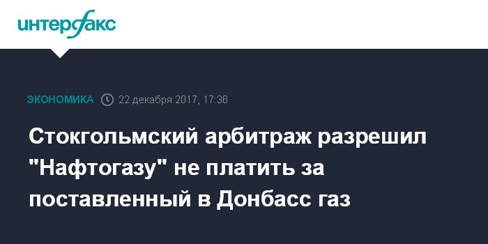 Москва. 22 декабря. INTERFAX.RU - НАК "Нафтогаз Украины" по решению Арбитражного института Торговой палаты Стокгольма не будет платить ПАО "Газпром" за поставленный на неконтролируемые Киевом территории Донбасса природный газ.