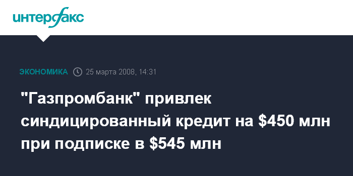 Москва. 25 марта. ИНТЕРФАКС-АФИ - "Газпромбанк" привлек синдицированный кредит на $450 млн при подписке в $545 млн, сообщил агентству "Интерфакс-АФИ" источник в банковских кругах. Подписание кредитного договора состоялось во вторник, 25 марта.