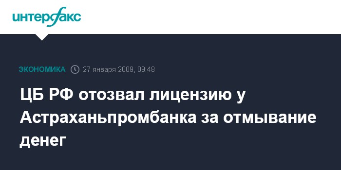 ЦБ РФ отозвал лицензию у Астраханьпромбанка за отмывание денег