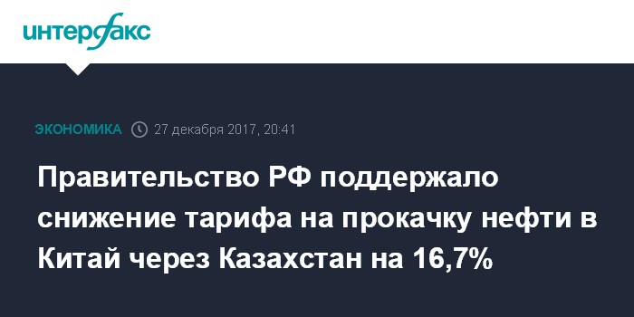 Москва. 27 декабря. INTERFAX.RU - Правительство РФ согласилось с предложением Федеральной антимонопольной службы снизить тариф на транспортировку нефти в Китай через Казахстан на 16,7%, сообщил глава "Транснефти" Николай Токарев в интервью телеканалу "Россия 24".