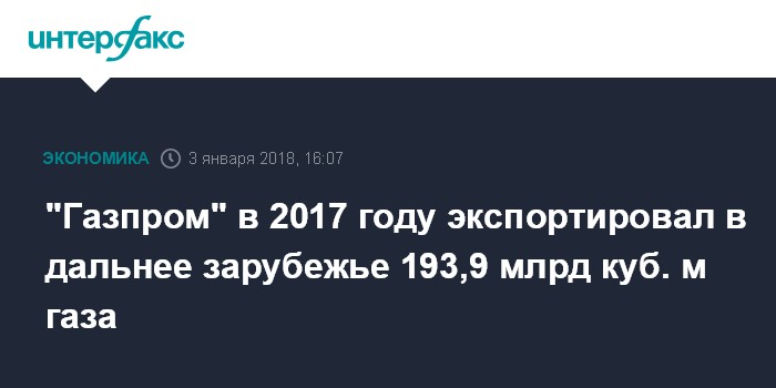 "2017 год стал годом новых экспортных рекордов "Газпрома". В январе компания достигла максимального показателя поставок за месяц - 19,1 млрд куб. м газа. 19 декабря был обновлен пиковый результат суточных поставок - 640 млн куб. м газа. Установлен новый рекорд экспорта за год. По оперативным данным, в 2017 году компания поставила в дальнее зарубежье 193,9 млрд куб. м газа. Это на 14,6 млрд куб. м (на 8,1%) превышает предыдущий максимум, достигнутый в 2016 году (179,3 млрд куб. м)", - сказал он.