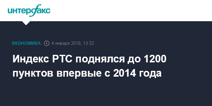 Москва. 4 января. INTERFAX.RU - Индекс РТС, один из основных российских фондовых индикаторов, днем в четверг поднялся до 1200 пунктов впервые с 2014 года на фоне общемирового подъема фондовых площадок и нефти, а также укрепления рубля.