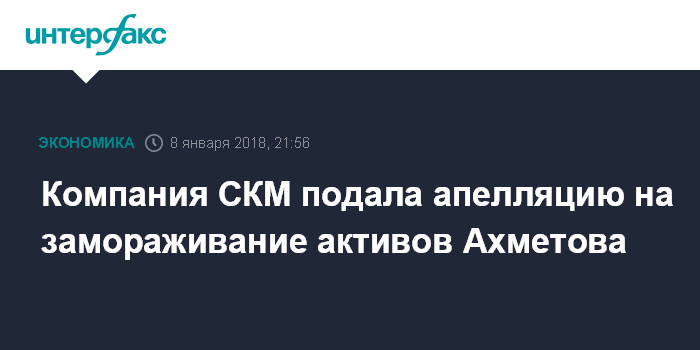Москва. 8 января. INTERFAX.RU - Компания СКМ в понедельник подала апелляцию на определение окружного суда Никосии (Кипр) о замораживании активов ее владельца Рината Ахметова на $820 млн, говорится в статье Financial Times со ссылкой на компанию.