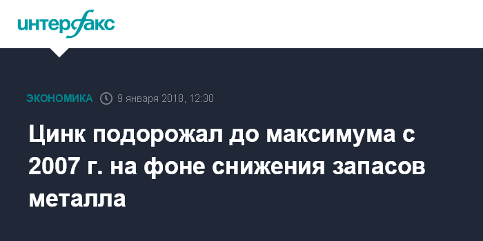 Москва. 9 января. INTERFAX.RU - Цена цинка во вторник выросла до максимума за 10 лет на фоне снижения глобальных запасов металла.