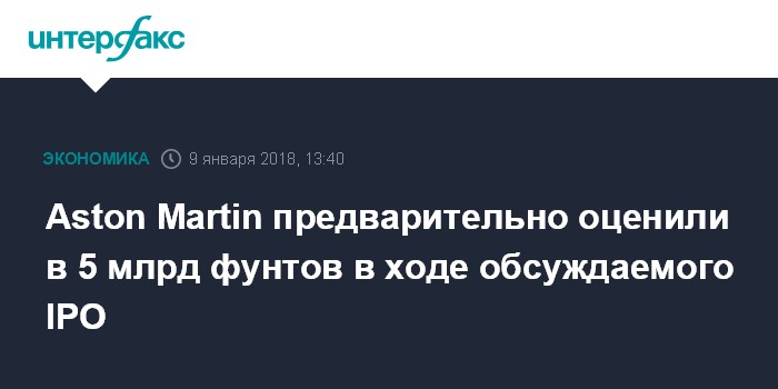 Москва. 9 января. INTERFAX.RU - Британский производитель престижных спортивных автомобилей Aston Martin Holdings Ltd может быть оценен в 5 млрд фунтов стерлингов ($6,8 млрд) в ходе IPO, возможность которого он рассматривает.