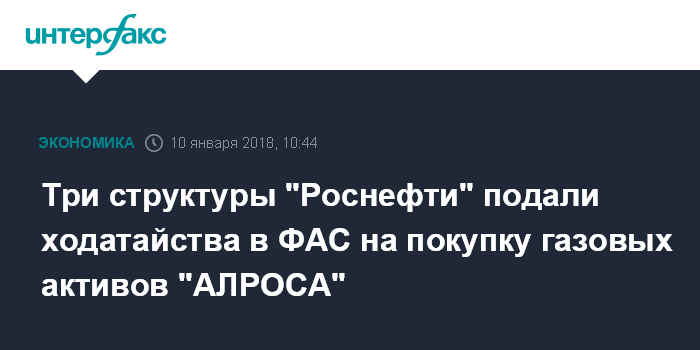 Москва. 10 января. INTERFAX.RU - Три структуры "Роснефти", включая "Башнефть", подали ходатайства в ФАС на покупку газовых активов "АЛРОСА".